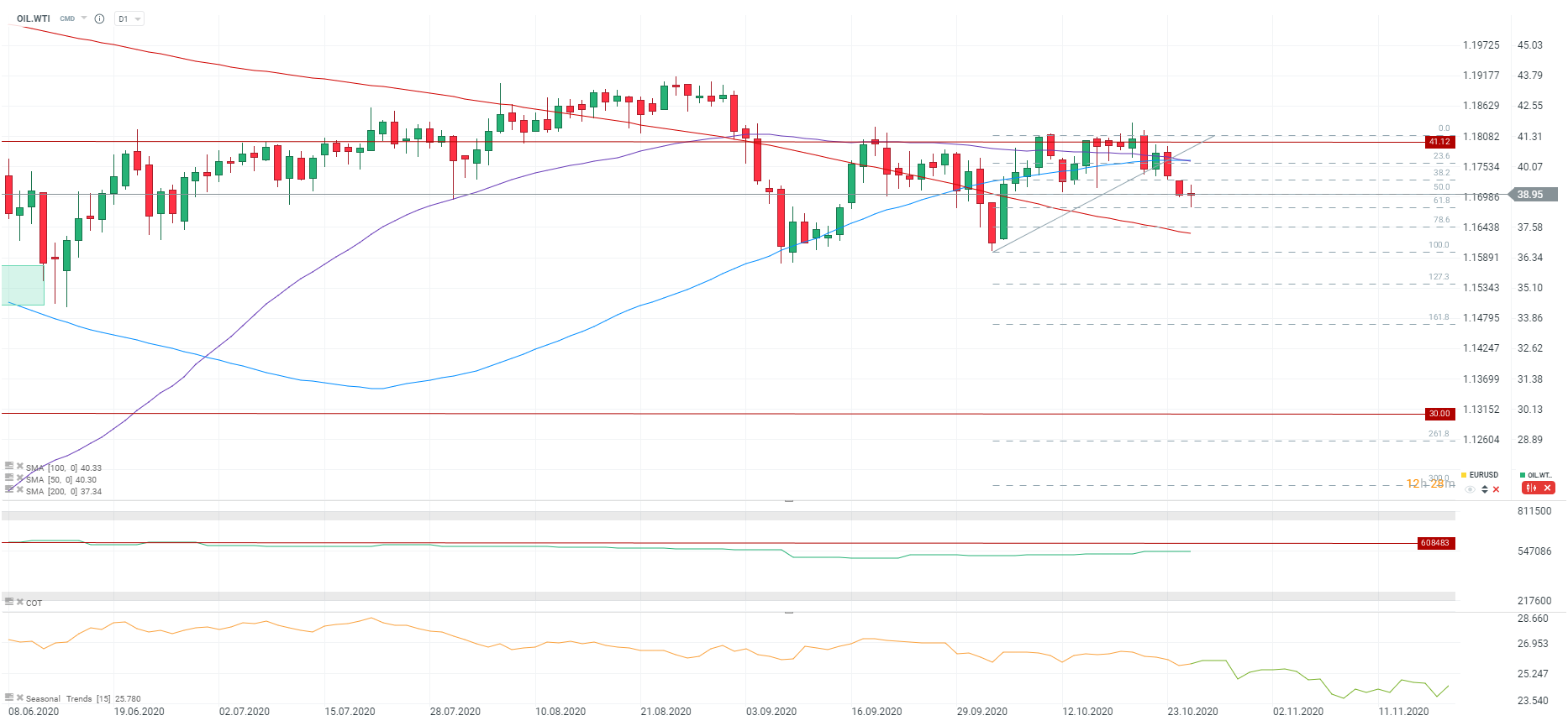 Ropa silnie cofa się od zeszłego tygodnia. Na razie utrzymane jest wsparcie w postaci zniesienia 61.8 ostatniejgo impulsu wzrostowego, choć warto zauwazyć, że kreuje się podażowy sygnał ze strony przecięcia średniej 100 oresowej przez 50 okresową od góry. Silne wsparice może mieć miejsce przy 200 okresowej średniej (zniesienie 78.6). Wygrana Bidena mogłaby doprowadzić do przetestowania kluczowego wsparcia w okolicach 36,5 USD za baryłkę. Źródło: xStation5