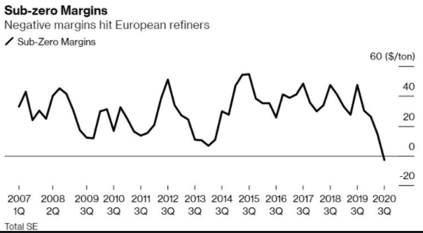 Marże rafineryjne w Europie spadają poniżej 0. Czy oznacza to totalną zmianę kierunku w stronę samochodów elektrycznych? Źródło: Bloomberg, Total