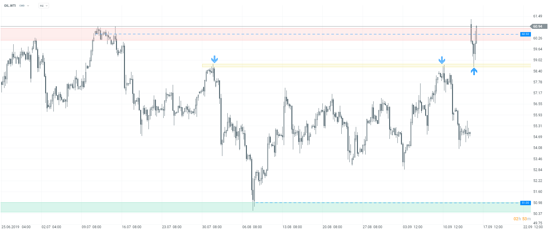 Cena ropy naftowej wraca w godzinach popołudniowych w okolice sesyjnych maksimów. Przyjrzyjmy się sytuacji technicznej na ropie WTI. Poniedziałek rozpoczął się od gigantycznej luki wzrostowej, jednak w kolejnych godzinach sesji rynek wszedł w fazę korekty. Tak duży skok ceny był oczywiście spowodowany atakiem na infrastrukturę naftową w Arabii Saudyjskiej, o czym pisaliśmy we wcześniejszych komentarzach. Jak do tej pory kupującym nie udało się wybić poziomów z otwarcia, jednak niewiele do tego brakuje. Aktualnie notowania zbliżają się do poziomu 61$ za baryłkę. Co ciekawe dzisiejsza korekta zdołała dotrzeć idealnie do poziomu ostatnich szczytów. Rynek pomimo dużej zmienności zachował się więc bardzo technicznie. Od razu po osiągnięciu strefy wynikającej z ZZB (zasady zmiany biegunów), kurs ruszył w górę. Dlatego też aktualnie możliwy jest dalszy ruch w kierunku północnym. Tak długo jak poziom 58,70$ jest broniony, obowiązuje scenariusz wzrostowy. Dopiero jego ewentualne pokonanie może doprowadzić do głębszych spadków.