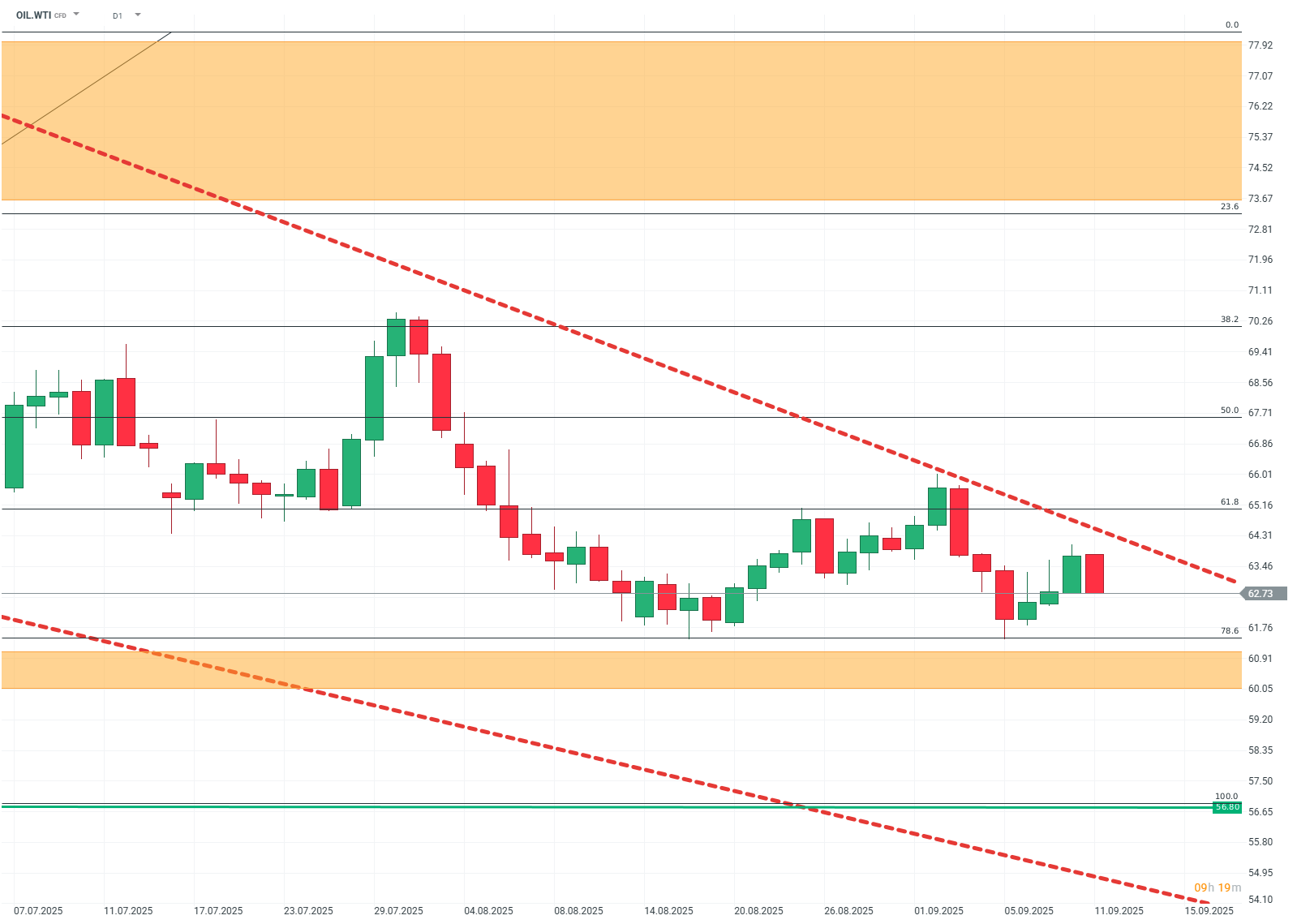 Na wykresie widoczny jest wyraźny trend spadkowy potwierdzony serią niższych szczytów. Cena pozostaje poniżej kluczowych oporów przy 65,20 USD gdzie znajduje się poziom FIBO 61. Najważniejsze wsparcie znajduje się w rejonie 61,70 USD, a jego wybicie otworzyłoby drogę w stronę 56,50 USD, w kierunku dolnego ograniczenie kanału. Dopóki rynek utrzymuje się poniżej 65,20 USD, przewaga sprzedających dominuje, natomiast dopiero wybicie ponad 67,70 USD mogłoby zasygnalizować zmianę trendu na wzrostowy.