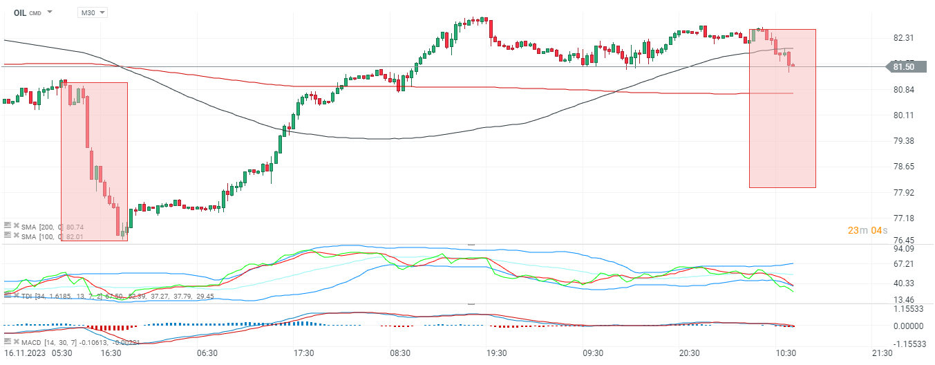 Potencjalna korekta 1:1 na OIL wskazywałaby na możliwy, krótkoterminowy ruch spadkowy w okolice 78 USD za baryłkę brent. Ostatnie rolowanie bardzo nieznacznie wzniosło ceny nieznacznie wyżej. Zmienność na ropie może wzrosnąć po publikacji danych o zapasach EIA (dziś, 16:30).