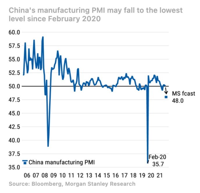 MS oczekuje bardzo niskiego odczytu indeksu PMI przemysłowego z Chin. Nie licząc dwóch zapaści gospodarczych z 2008 oraz 2020 roku, może to być najniższy odczyt w historii śledzenia tego indeksu od 2005 roku! Źródło: Morgan Stanley, Bloomberg