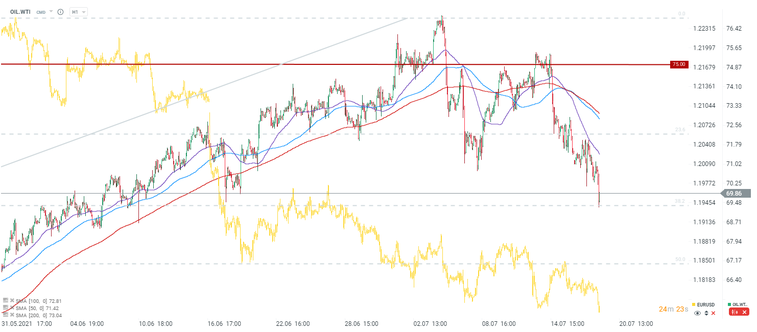Ropa WTI spadła poniżej 70 USD za baryłkę, ale reaguje na zniesienie 38.2 fali wzrostowej od kwietnia tego roku. Źródło: xStation5