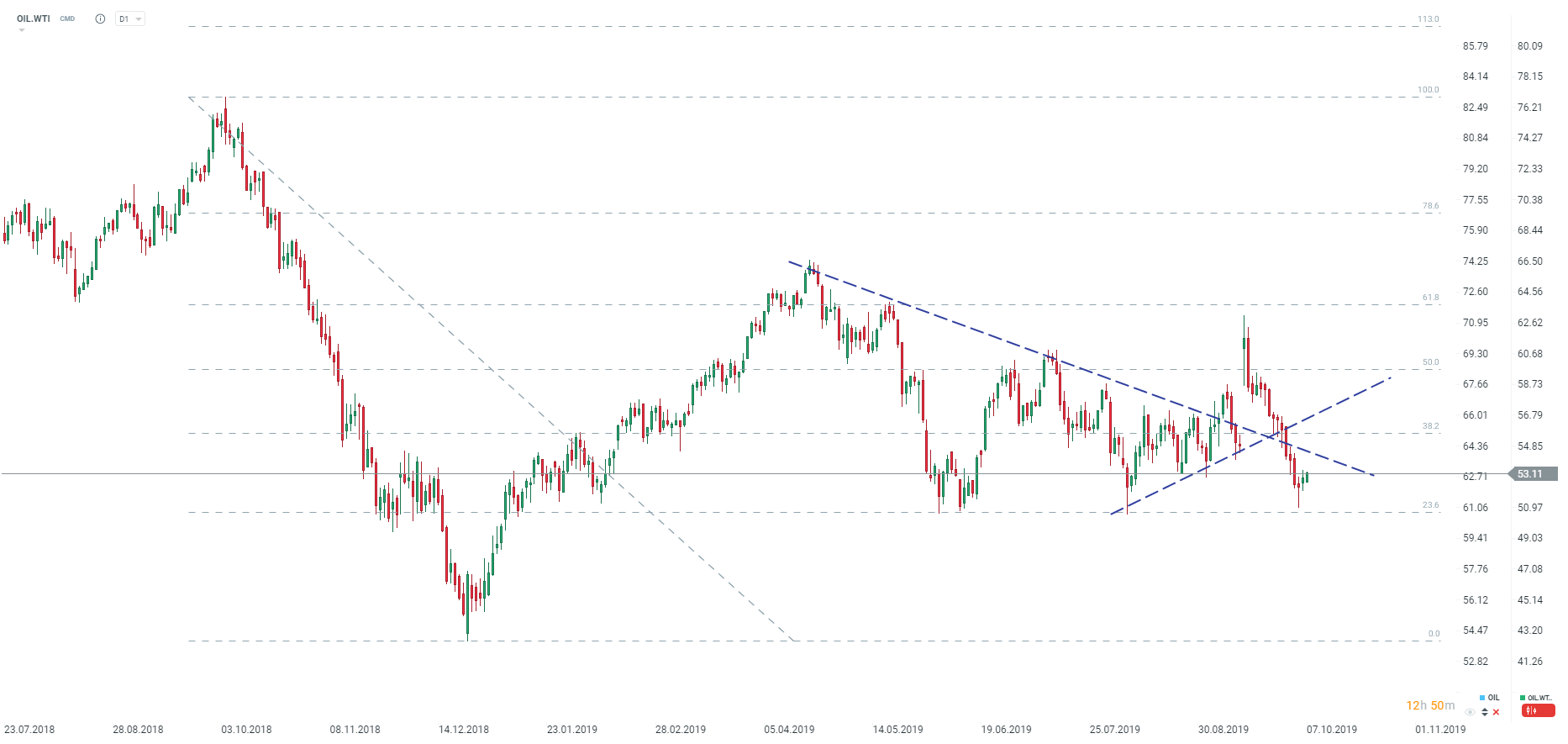 Na WTI obserwujemy trzykrotne odbicie, które następowały mniej więcej po ok. 2 miesiącach. Źródło: xStation5