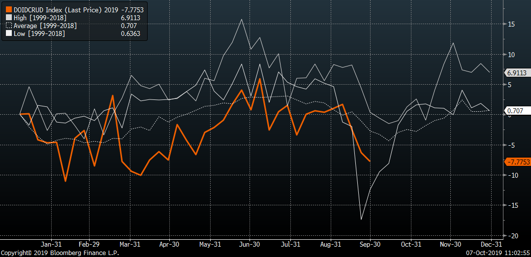 Zachowanie implikowanego popytu na ropę w USA zachowuje się podobnie jak w 2009 oraz 2015 roku, czyli w latach, kiedy nastroje nie należały do najlepszych. Jednocześnie zachowanie popytu jest najgorsze w ostatnich 10 latach, ale bliskie temu, co obserwujemy w ostatnich 5 latach. Na wykresie średnie 20 letnie. Źródło: Bloomberg