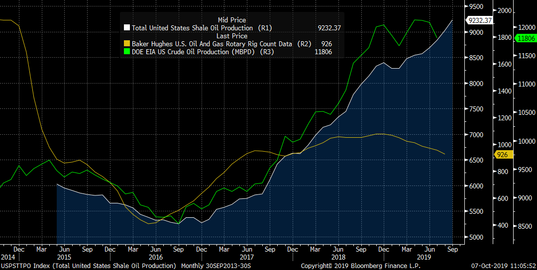 Produkcja ropy naftowej z łupków w USA przyśpieszyła od marca bieżącego roku. Z drugiej strony może wydawać się, że jest to zmierzch kolejnej rewolucji łupkowej, biorać pod uwagę silne odwrócenie ilości wież wiertniczych od końca poprzedniego roku. Źródło: Bloomberg