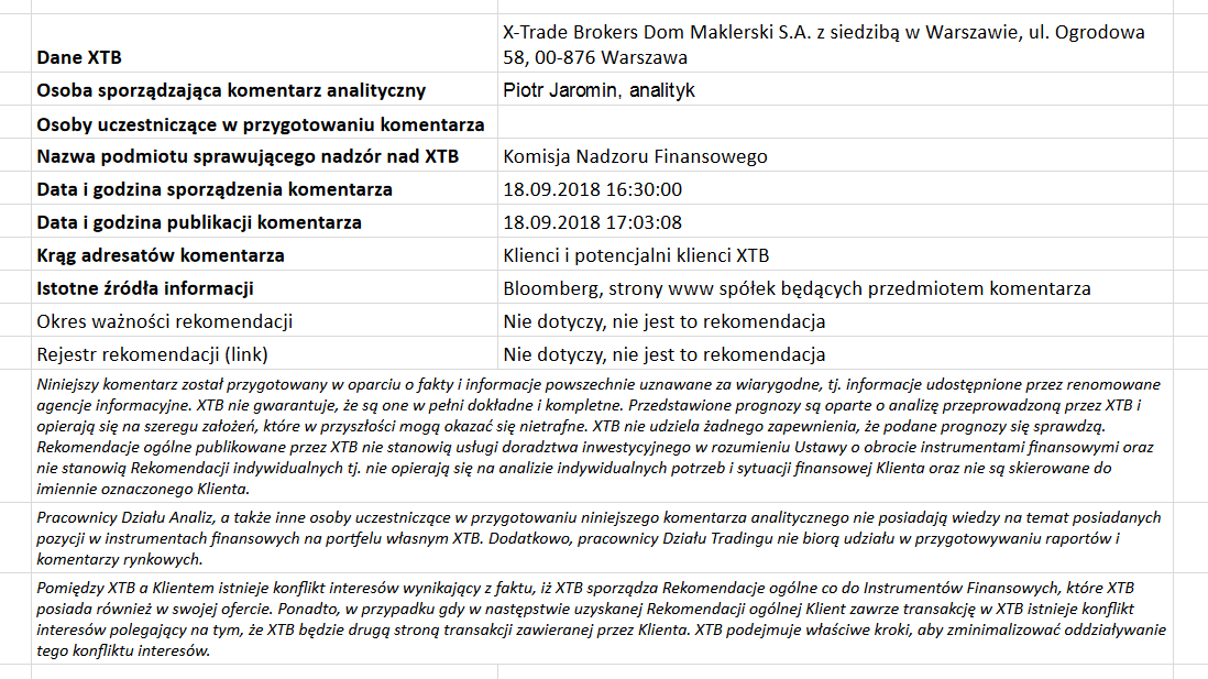 Ta publikacja handlowa jest informacyjna i edukacyjna. Nie jest rekomendacją inwestycyjną ani informacją rekomendującą lub sugerującą strategię inwestycyjną. W materiale nie sugerujemy żadnej strategii inwestycyjnej ani nie świadczymy usługi doradztwa inwestycyjnego. Materiał nie uwzględnia indywidualnej sytuacji finansowej, potrzeb i celów inwestycyjnych klienta. Nie jest też ofertą sprzedaży ani subskrypcji. Nie jest zaproszeniem do nabycia, reklamą ani promocją jakichkolwiek instrumentów finansowych. Publikację handlową przygotowaliśmy starannie i obiektywnie. Przedstawiamy stan faktyczny znany autorom w chwili tworzenia dokumentu. Nie umieszczamy w nim żadnych elementów oceniających. Informacje i badania oparte na historycznych danych lub wynikach oraz prognozy nie stanowią pewnego wskaźnika na przyszłość. Nie odpowiadamy za Twoje działania lub zaniechania, zwłaszcza za to, że zdecydujesz się nabyć lub zbyć instrumenty finansowe na podstawie informacji z tej publikacji handlowej. Nie odpowiadamy też za szkody, które mogą wynikać z bezpośredniego czy też pośredniego wykorzystania tych informacji. Inwestowanie jest ryzykowne. Inwestuj odpowiedzialnie.