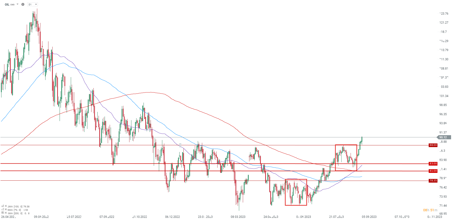 Arabia Saudyjska ogłasza, że decyduje się na przedłużenie dobrowolnego cięcia produkcji na poziomie 1 mln brk na dzień do końca 2023 roku! Wcześniej wskazywano, że dobrowolne cięcie ma być przedłużone jedynie na październik. Rosja decyduje się również iść podobną drogą i decyduje się na cięcie eksportu o 300 tys. brk na dzień do końca tego roku. Warto wspomnieć, że cięcie o 300 tys. pojawiło się już wcześniej w tym roku, natomiast w ostatnich dwóch miesiącach było to zwiększone cięcie o 500 tys. brk.