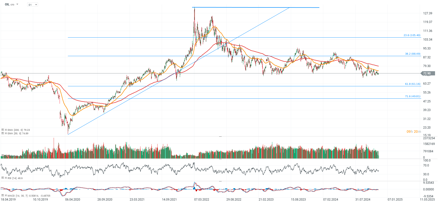 W scenariuszu wzrostowym istotny opór dla ropy stanowią okolice 88 USD, gdzie widzimy 38.2 Fibo i poprzednier reakcje cenowe. Wcześniej jednak byki będą musiały przebić się powyżej 80 USD (EMA200, czerwona linia). Pierwsze ważne wsparcie w przypadku spadków cen ropy to okolice 60 - 61 USD za baryłkę Brent (61.8 Fibo).