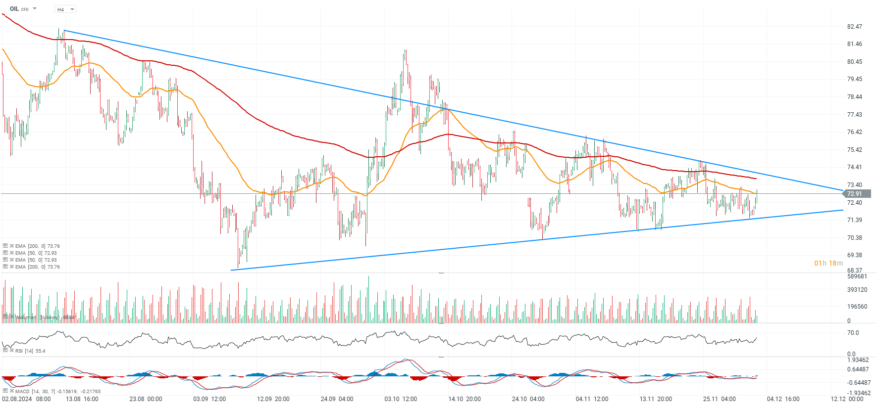 Surowiec energetyczny znalazł się w formacji przypominającej symetryczny trójkąt. Wybicie górą, powyżej 74 USD za baryłkę może otworzyć drogę do zmiany trendu. Spadek do 71 USD mógłby uprawdopodobnić scenariusz kolejnego, silnego impulsu spadkowego.