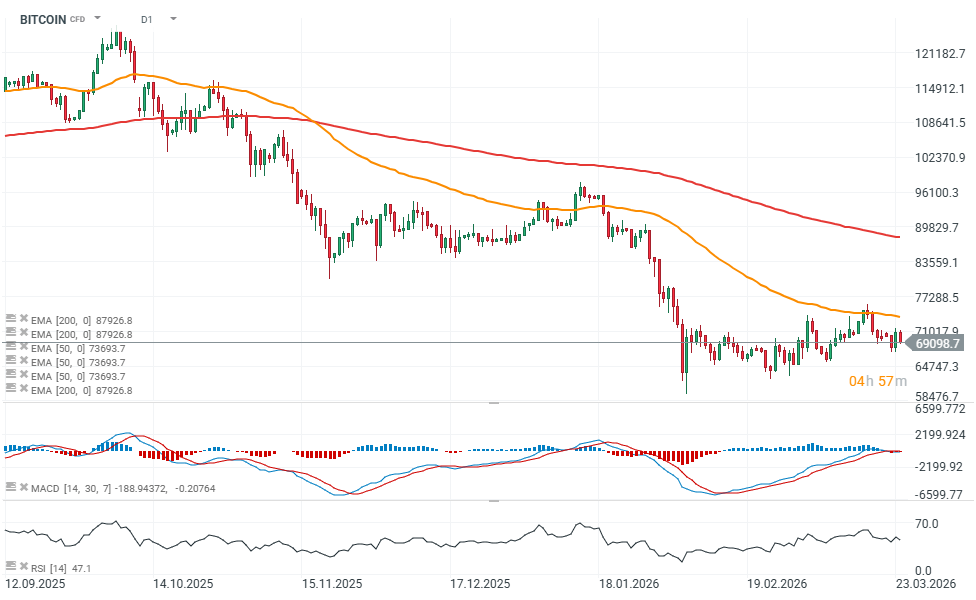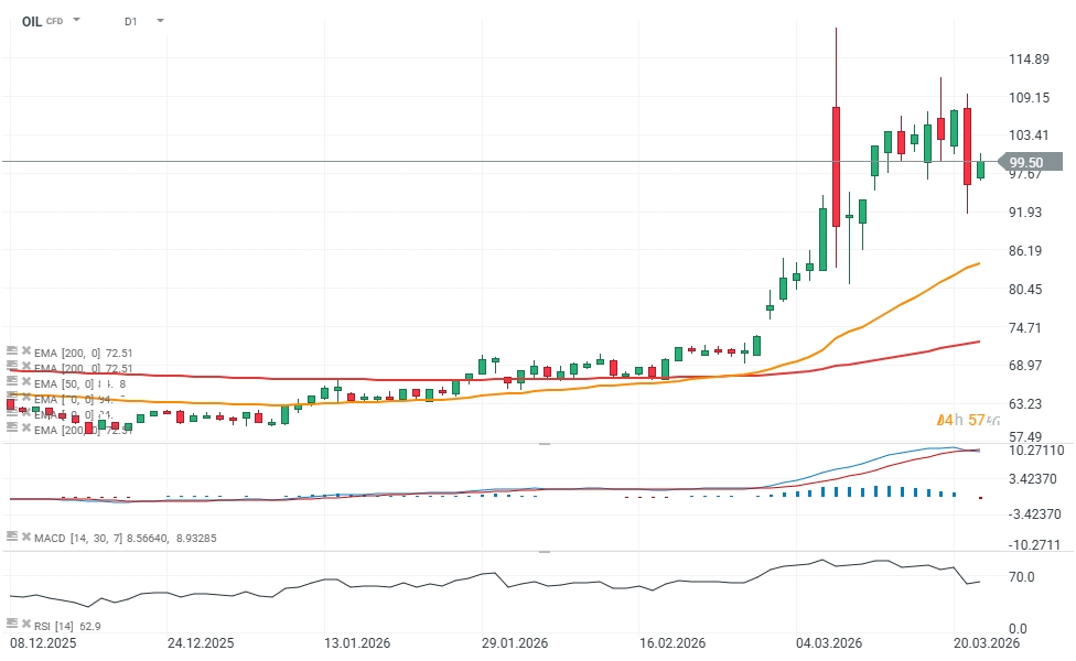 Kontrakty na ropę Brent (OIL) rosną dziś prawie 3,5% i wracają w pobliże 100 USD za baryłkę, odbijająć prawie 10% względem dna wczorajszej wyprzedaży, spowodowanej tweetem Donalda Trumpa. Wzrost ten osłabia nastroje zarówno na rynku akcji, jak i kryptowalutach, gdzie Bitcoin cofa się dziś ponownie poniżej 70 tys. USD w odpowiedzi na rosnące rentowności amerykańskich obligacji.