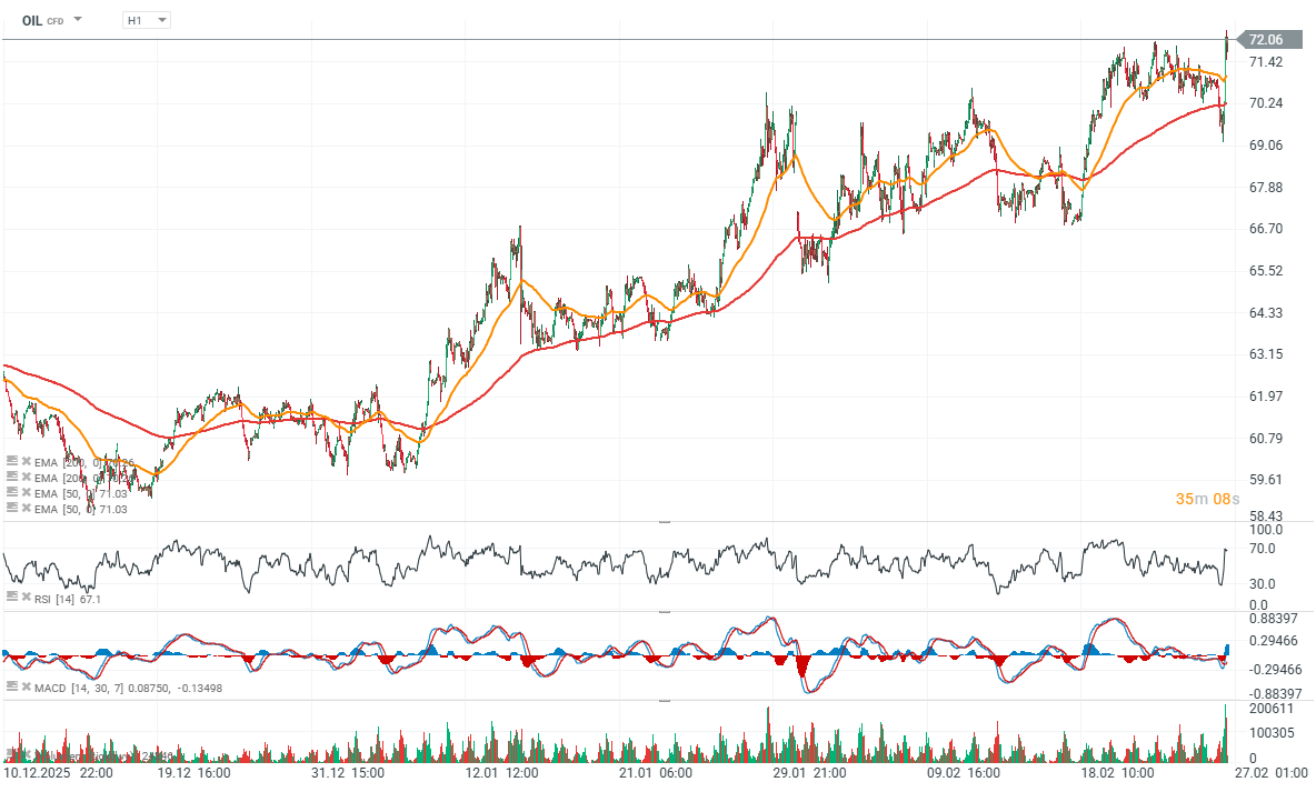 Ropa wraca powyżej 72 USD za baryłkę, a uwaga rynku przenosi się na niedzielne posiedzenie OPEC+, gdzie rozważana jest niewielka podwyżka wydobycia od kwietnia. Wzrost cen ropy wydaje się dziś utrzymywać pod presją giełdowe indeksy.