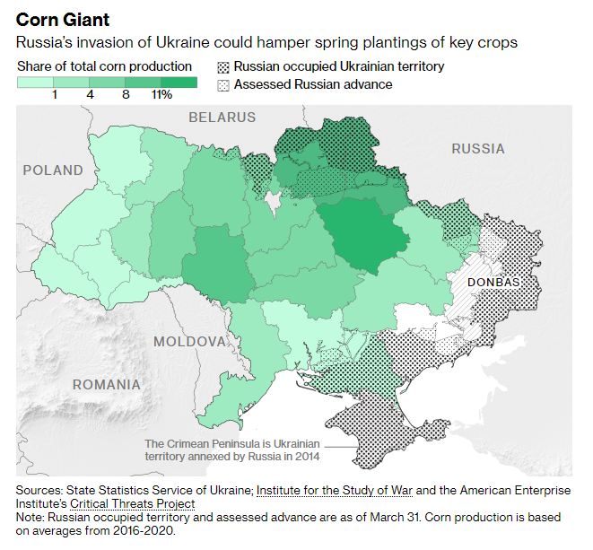 Kluczowe rejony uprawy kukurydzy w Ukrainie są zagrożone bezpośrednio przez wojnę z Rosją. Źródło: Bloomberg