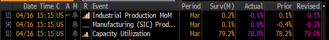 Dzisiejsze dane dotyczące produkcji przemysłowej w Stanach Zjednoczonych mogły minimalnie rozczarować inwestorów. Po poprzednim małym wzroście na poziomie 0,1% m/m oczekiwano przyśpieszenia za marzec do 0,2% m/m. Produkcja spadła jednak o 0,1% m/m. Przetwórstwo pozostało bez zmian, pomimo oczekiwań wzrostu. Nieznacznie zmniejszono spadek za poprzedni miesiąc. Ważne jest jednak niskie wykorzystanie mocy wytwórczych w porównaniu do konsensusu. Poprzednie dane zostały zrewidowane wyraźnie w górę.