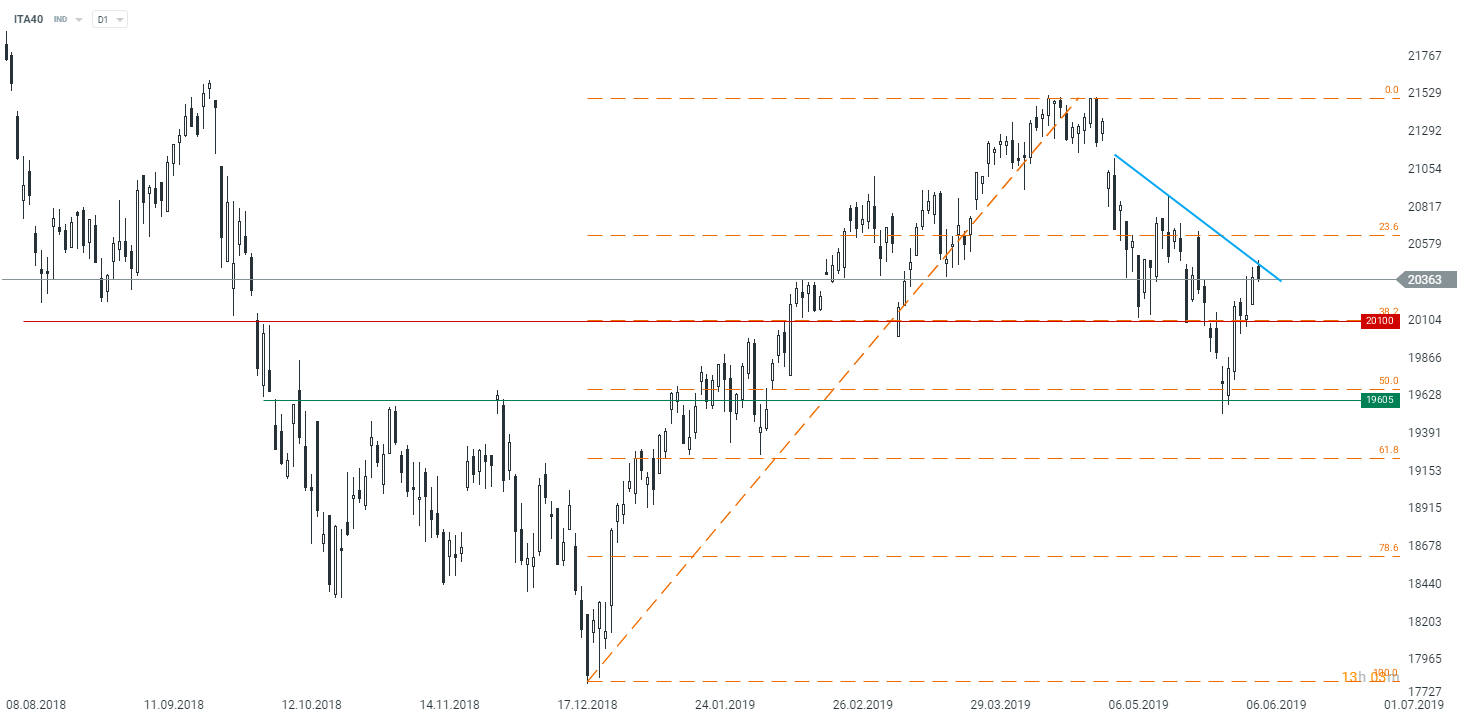 Włoski FTSE MIB (ITA40) nie doświadczył dużych ruchów w następstwie publikacji danych o produkcji. Indeks utrzymuje się na lekkich plusach, jednak nie możemy wykluczyć próby powrotu w kierunku poziomu 20100 pkt. Źródło: xStation5