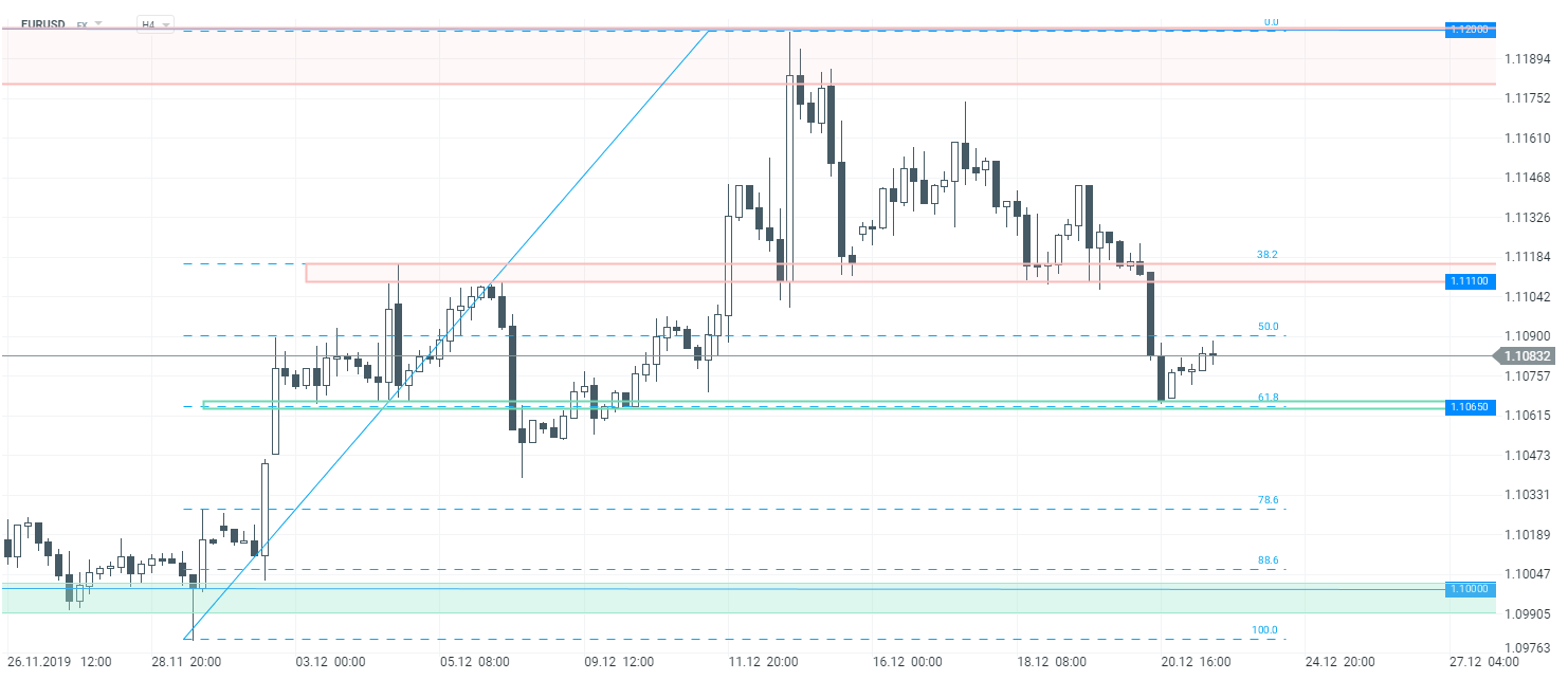 Patrząc na najpopularniejszą parę walutową -EURUSD, ruchy o poranku są bardzo niewielkie. Zakres ruchu od początku sesji nie przekroczył nawet 15 pipsów. Patrząc na interwał H1 najbliższym oporem jest dopiero strefa przy 1.1110. Z kolei wsparcie znajduje się przy mierzeniu 61,8% Fibonacciego - 1.1065.