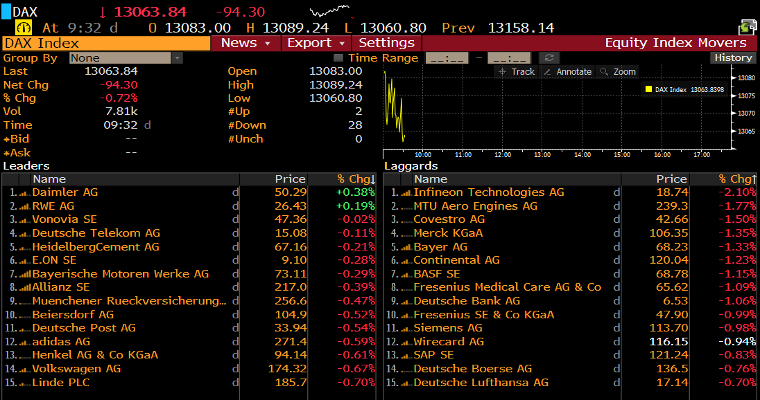 Spółki z indeksu DAX na początku czwartkowej sesji. Źródło: Bloomberg