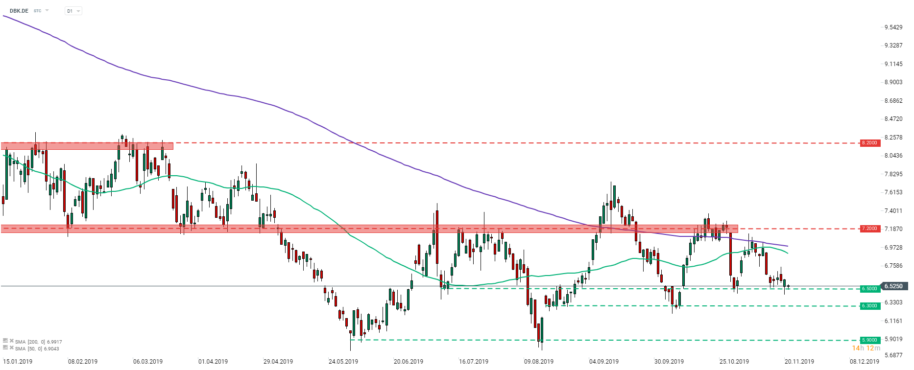 Deutsche Bank (DBK.DE) zdołał wyhamować spadki i zaczął poruszać się w konsolidacji. Na wykresie można jednak zauważyć sekwencję niższych szczytów, dlatego strona sprzedająca wydaje się mieć przewagę. W momencie przygotowywania tego komentarza, akcje testują krótkoterminowy poziom horyzontalny przy 6,50 EUR. Nie oznacza to, że uniemożliwi on zejścia niżej w kierunku zakresu nowowań z przełomu października i listopada. W przypadku wybicia dołem, uwaga inwestorów powinna być skierowana na wsparcie przy 6,30 EUR. Źródło: xStation5.