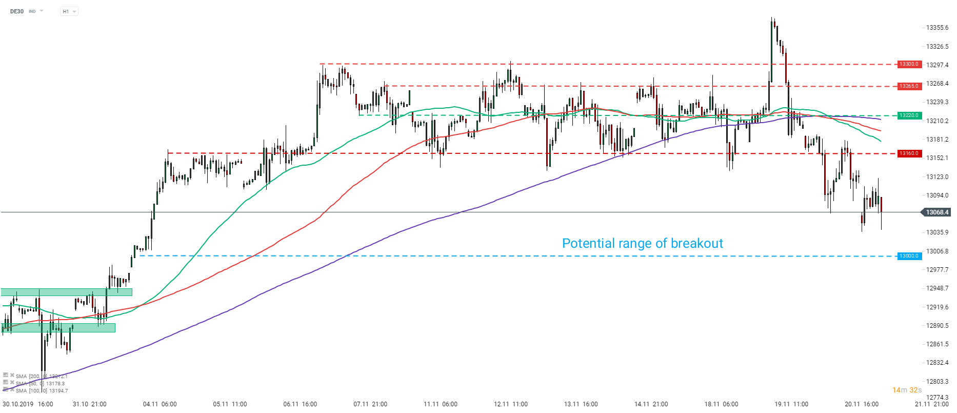 Podczas wczorajszej sesji DE30 wybił dolne ograniczenie zakresu konsolidacji. Spadki wyhamowały jednak w rejonach poziomu 13 100 pkt, skąd doszło do większego odbicia. Sentyment pogorszył się jednak w godzinach późno popołudniowych i ponownie mogliśmy obserwować zejście w rejony sesyjnych minimów. Aktualnie kluczowym poziomem do obserwacji powinny być okolice 13000 pkt, poziom ten nie tylko stanowi ważną barierę psychologiczną, ale wynika także z zakresu poprzedniej konsolidacji.