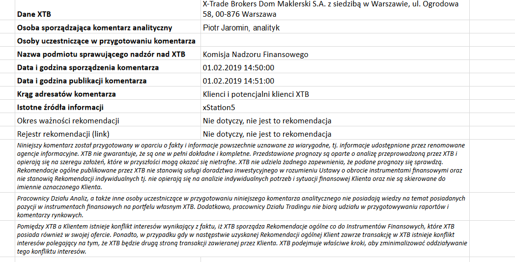 Ta publikacja handlowa jest informacyjna i edukacyjna. Nie jest rekomendacją inwestycyjną ani informacją rekomendującą lub sugerującą strategię inwestycyjną. W materiale nie sugerujemy żadnej strategii inwestycyjnej ani nie świadczymy usługi doradztwa inwestycyjnego. Materiał nie uwzględnia indywidualnej sytuacji finansowej, potrzeb i celów inwestycyjnych klienta. Nie jest też ofertą sprzedaży ani subskrypcji. Nie jest zaproszeniem do nabycia, reklamą ani promocją jakichkolwiek instrumentów finansowych. Publikację handlową przygotowaliśmy starannie i obiektywnie. Przedstawiamy stan faktyczny znany autorom w chwili tworzenia dokumentu. Nie umieszczamy w nim żadnych elementów oceniających. Informacje i badania oparte na historycznych danych lub wynikach oraz prognozy nie stanowią pewnego wskaźnika na przyszłość. Nie odpowiadamy za Twoje działania lub zaniechania, zwłaszcza za to, że zdecydujesz się nabyć lub zbyć instrumenty finansowe na podstawie informacji z tej publikacji handlowej. Nie odpowiadamy też za szkody, które mogą wynikać z bezpośredniego czy też pośredniego wykorzystania tych informacji. Inwestowanie jest ryzykowne. Inwestuj odpowiedzialnie.