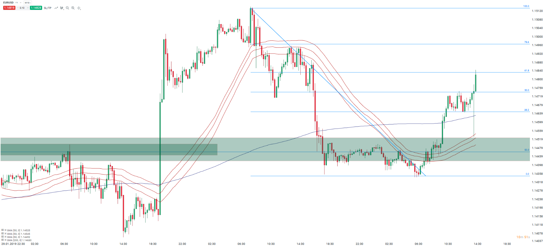EURUSD po reteście 1,1450 po danych wraca na dzienne maksima i testuje zniesienie 61,8% ostatnich spadków. Źródło: xStation5.