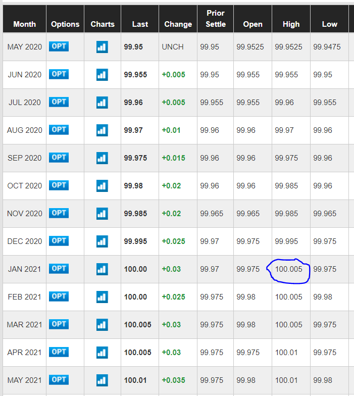 Rynek zaczął wyceniać możliwość obniżki stóp przez Fed do poziomów negatywnych (kontrakty powyżej 100). Źródło: CME