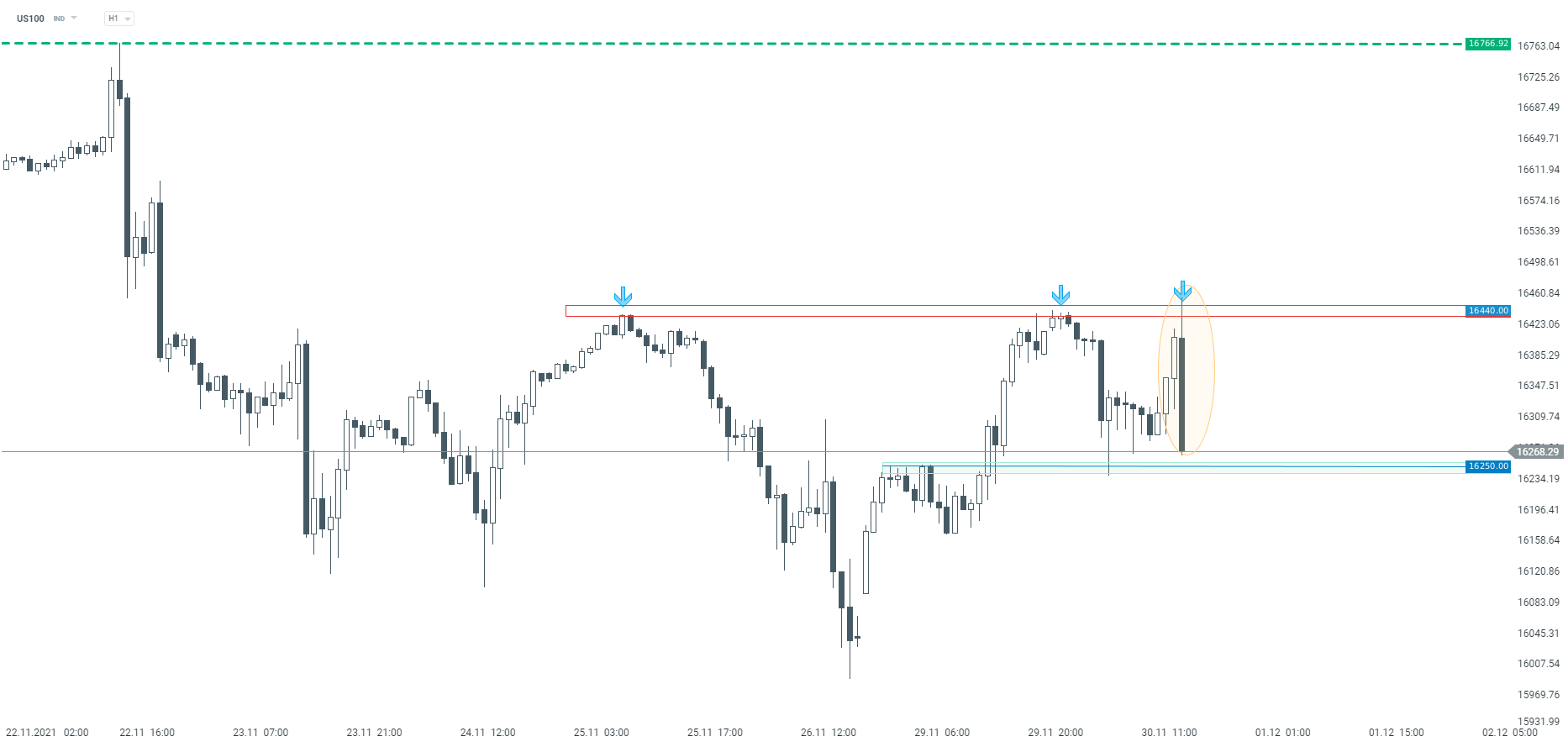 Silna reakcja podażowa na indeksach w USA, US100 nurkuje i odbija od oporu wspomniango w analizie wideo. Źródło: xStation5