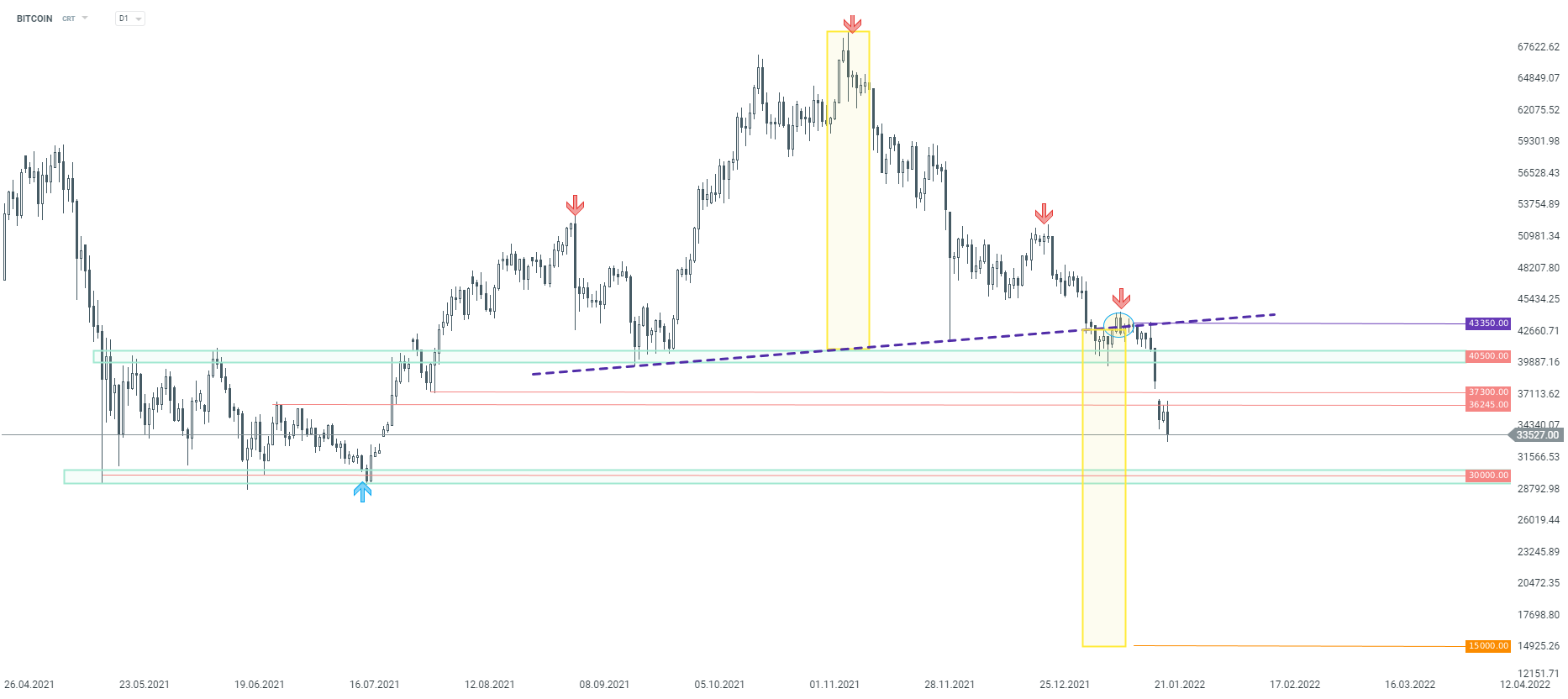 Rynek kryptowalut także radzi sobie w ostatnich dniach fatalnie. Przecena na Bitcoinie sięga już ponad 50%, licząc od historycznych maksimów z listopada 2021 roku. Patrząc na wykres Bitcoina, na interwale D1 utworzyła się szeroka formacja pochodząca z klasycznej analizy technicznej - głowa z ramionami. Choć na tę chwilę wydaje się to mało realne, tak modelowy zasięg dla tego typu struktury to nawet poziom 15 tys. USD. Wcześniej jednak należy zwrócić uwagę na poziom 30 tysięcy dolarów, który pozostaje kluczowym wsparciem.