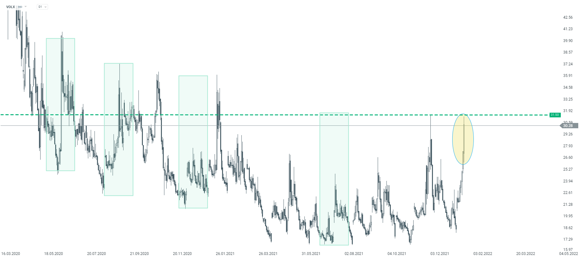 Index VIX (VOLX), potocznie nazywany indeksem strachu, mierzy oczekiwaną zmienność na amerykańskim rynku akcji. Od kilku sesji VOLX notuje systematyczne wzrosty, co rodzi ryzyko jeszcze większych ruchów na rynku. Patrząc na wykres D1, kurs dotarł do potencjalnego poziomu oporu przy 31,5, gdzie znajduje się także maksimum z grudnia i równość z poprzednimi ruchami wzrostowym. W przypadku pokonania tego poziomu, indeks może przyspieszyć wzrost, a co za tym idzie zmienność na rynku akcji może być jeszcze większa.