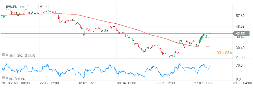 Kurs akcji Ryvu Therepeutics (RVU.PL), interwał H4. Byki zdołały pokonać 200 sesyjną średnią na interwale tygodniowym, która przebiega w okolicach 31 PLN za akcję. Cena dwukrotnie retestowała ten poziom, kupujący zdołali utrzymać bycze momentum. Jednocześnie RSI zbliża się do poziomu 70 punktów. Źródło: xStation 5