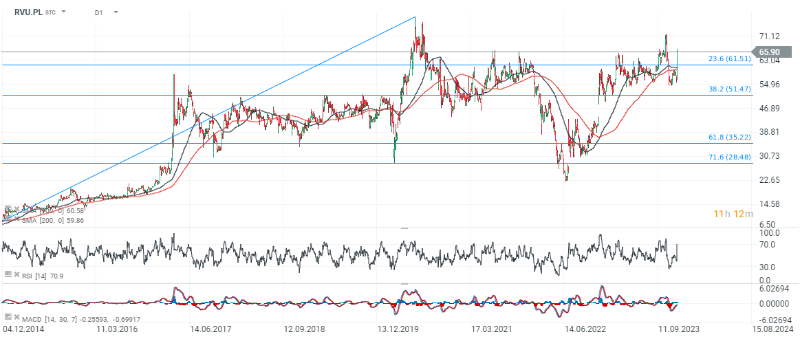 Akcje Ryvu (RVU.PL) zdołały przełamać się powyżej SMA200 (czerwona linia), po wczorajszych doniesieniach o przełomowym efekcie leczenia białaczki. Źródło: xStation5