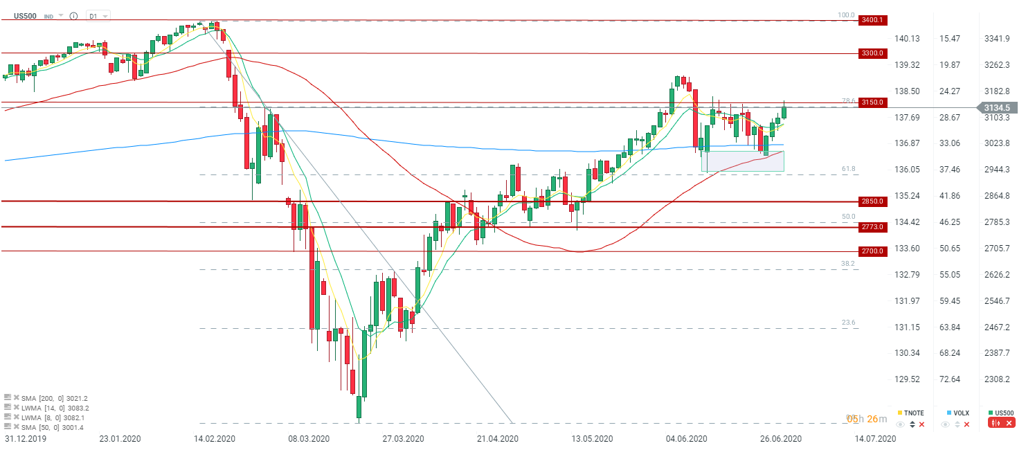 S&P 500 reaguje negatywnie na silny opór w okolicach poziomu 3150 punktów. Ostatnio w górę poziom ten przełamany został na dłuższy czas 6 czerwca i później wzrosty trwały jedynie jeszcze 1 dzień. Źródło: xStation5