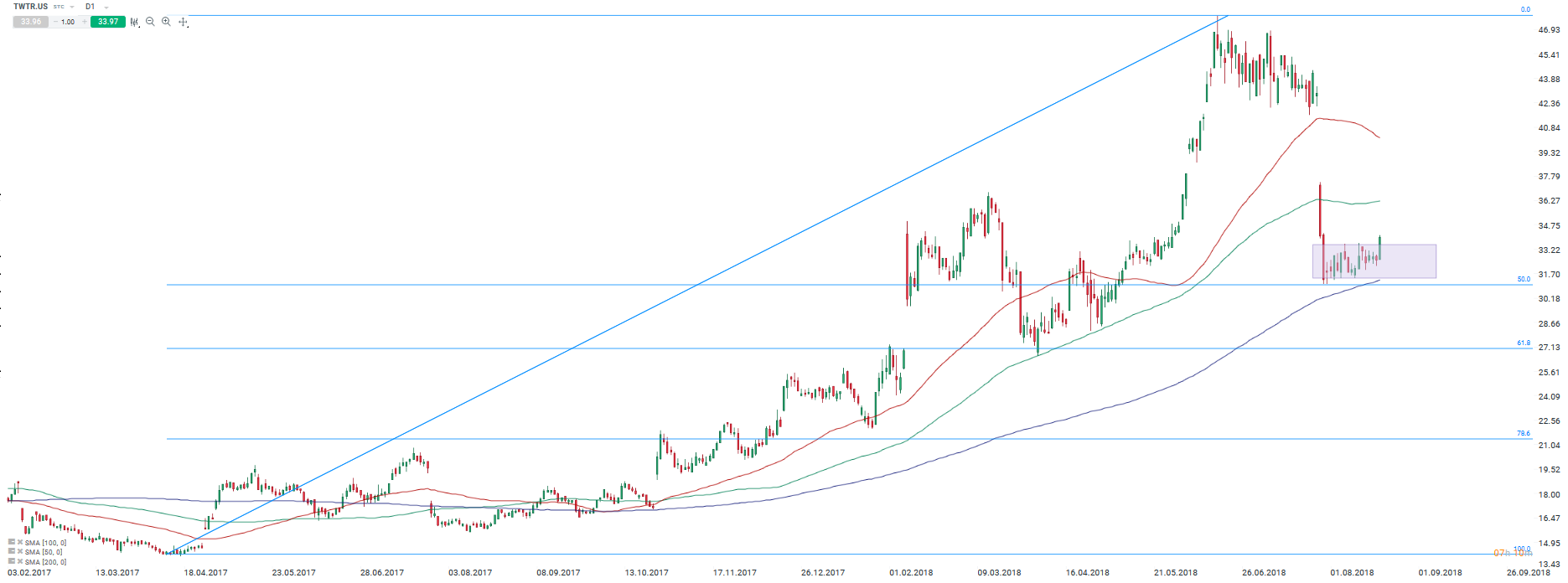 Lipcowa przecena akcji Twittera zatrzymała się w okolicach zniesienia 50% fibonacciego ruchu wzrostowego od wiosny 2017 roku. Źródło: xStation5.