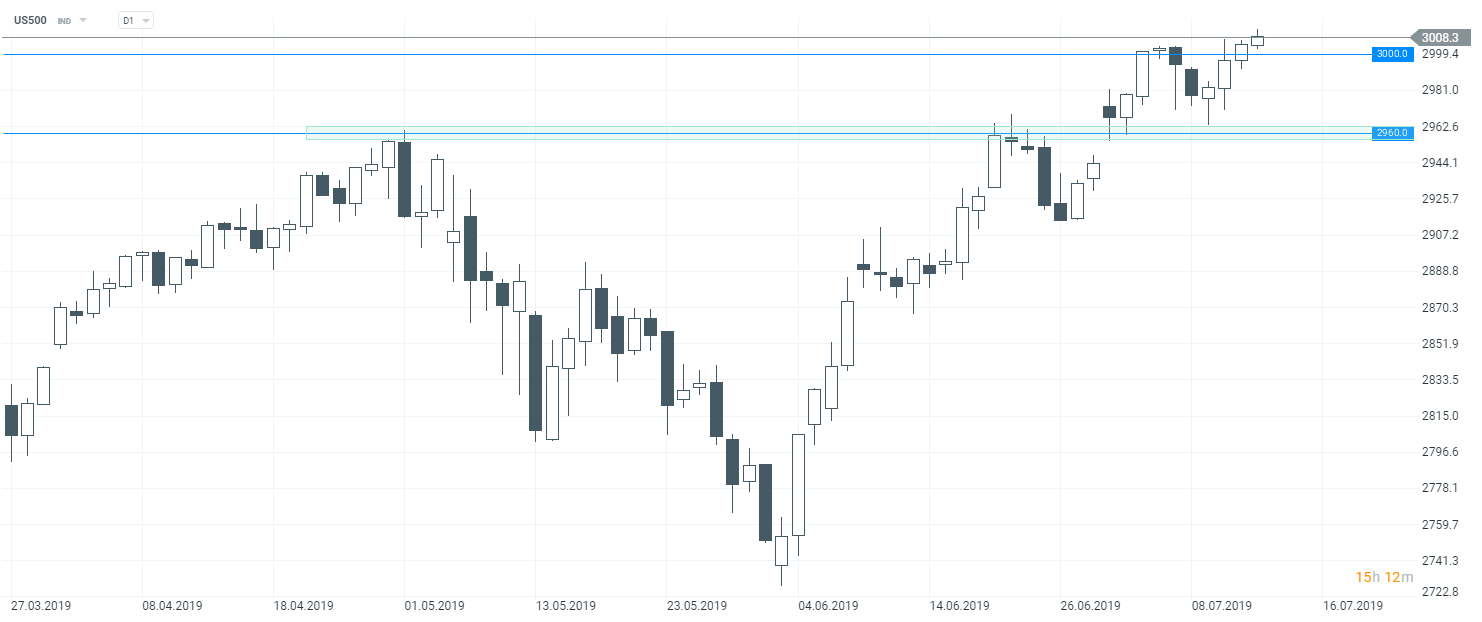 US500 utrzymuje się powyżej 3000 pkt. Dopóki cena znajduje się ponad strefą przy 2960 pkt, obowiązuje tendencja wzrostowa. Aby mówić o większej korekcie spadkowej, rynek musiałby spaść poniżej strefy zaznaczonej kolorem zielonym. Źródło: xStation5