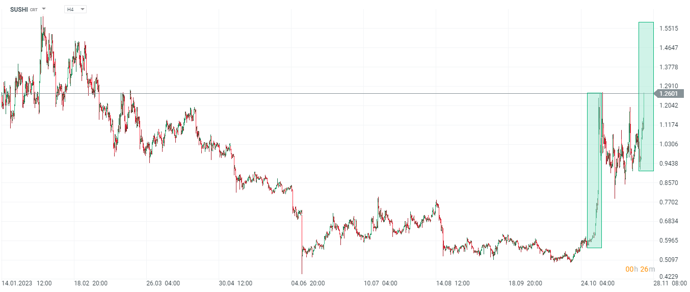W czasie gdy handel na Wall Street jest dziś zamknięty z uwagi na Święto Dziękczynienia, Bitcoin notuje niewielkie 0,5% spadki, choć utrzymuje się powyżej bariery 37,000 USD. Znacznie lepiej na tle konsolidującego BTC radzą sobie mniejsze kryptowaluty. To do nich w czasie trendu bocznego zazwyczaj przechodzi część kapitału z konsolidującego po silnych wzrostach Bitcoina i nie inaczej jest tym razem. Ponad 16% wzrosty notuje SushiSwap, którego CEO w ostatnim czasie zaproponował 'nową tokonomie' o której rynek ma dowiedzieć się znacznie więcej 25 listopada. Do tego czasu rynek może rozgrywać scenariusz 'wzrostów pod wydarzenie', popularny wśród rynku kryptowalut. Nowy model dla Sushi ma na celu m.in. niższe 'rozwodnienie' poprzez nowe emisje tokenów oraz modyfikacje technologiczne, które mają uczynić go konkurencyjnym, zwłaszcza na tle konkurencyjnego Uniswap.