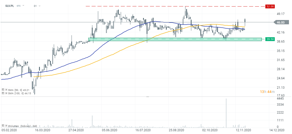 Po bardzo dynamicznym odbiciu od marcowego dołka, kurs Selvity porusza się w trendzie bocznym. Okolice 39,50 zł ograniczały kilkukrotnie ruch spadkowy. Dziś cena akcji wspięła się powyżej 50-dniowej i 100-dniowej średniej kroczącej. Źródło: xStation5