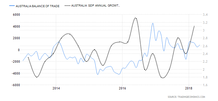 Bilans handlowy pozostaje ograniczony w Australii, jednak wzrost gospodarczy w tym kraju przyśpiesza. Źródło: Trading Economics