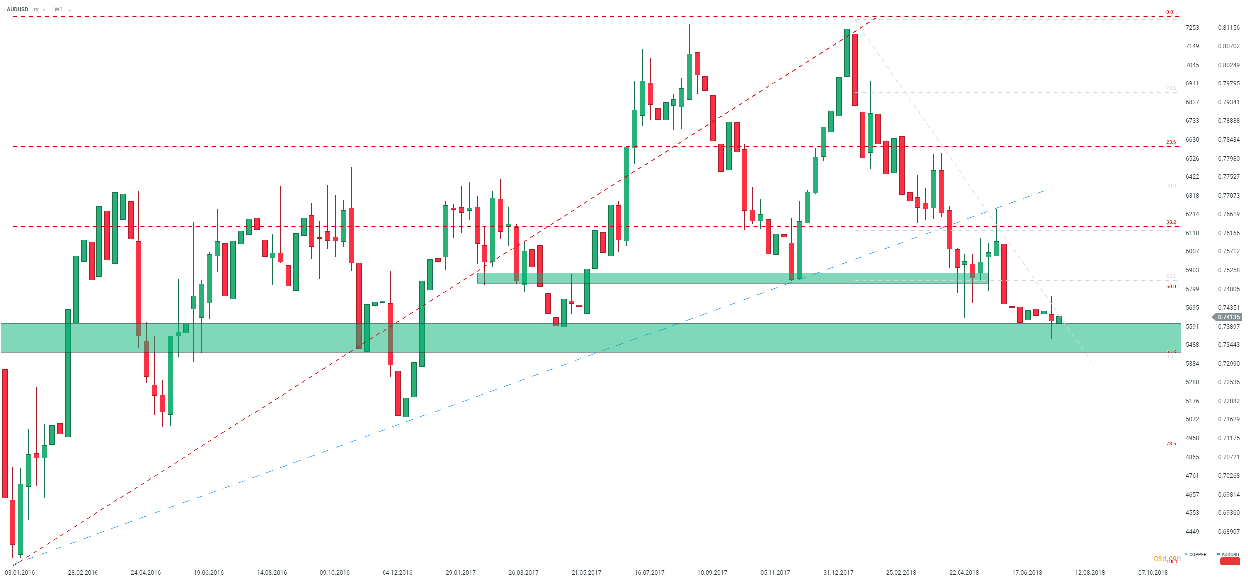Dolar australijski odnalazł silną strefę popytową, która jest zlokalizowana powyżej zniesienia 61.8 całego odbicia od początku 2016 roku. Niemniej niedaleko wyżej przy zniesieniu 50.0 oraz przy poziomie 0,7500 znajduje się silna podaż, która nie pozwala na potencjalne wybicie się pary. Źródło: xStation5