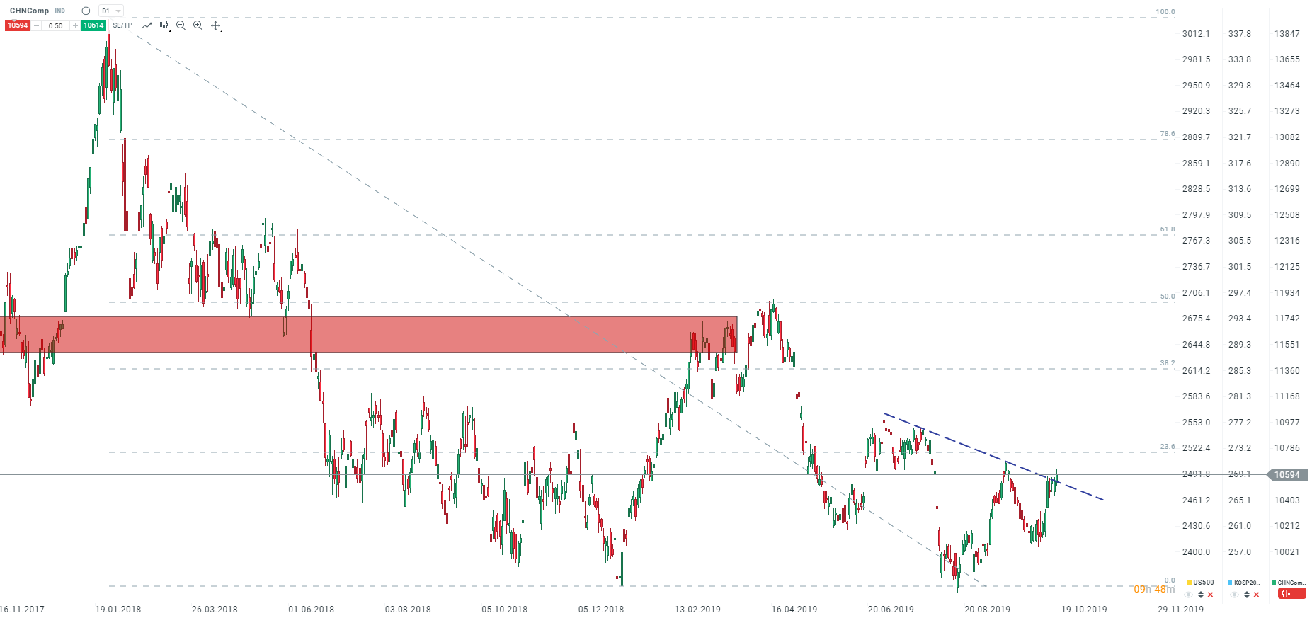 Jak widać indeks Hang Seng chińskich spółek odbił nieco w ostatnim czasie, ale znajduje się nieporównywalnie niżej w porównaniu do zachodnich indeksów giełdowych. Źródło: xStation5
