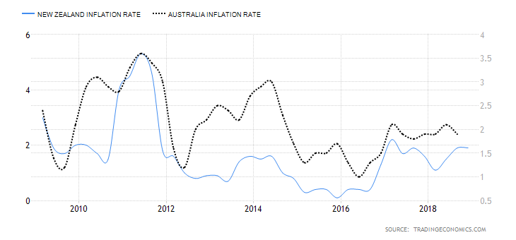 Inflacja w Australii jest nieco bardziej zmienna niż w Nowej Zelandii, więc teoretycznie powinniśmy oczekiwać faktycznego mocniejszego spowolnienia i dostosowania się dynamiki do tej z Nowej Zelandii. Z drugiej strony dynamika odbicia w 2018 roku w Nowej Zelandii była większa niż w Australii. Wydaje się również, że inflacja w Australii reaguje nieco wcześniej na zmiany gospodarcze na świecie. Źródło: Trading Economics