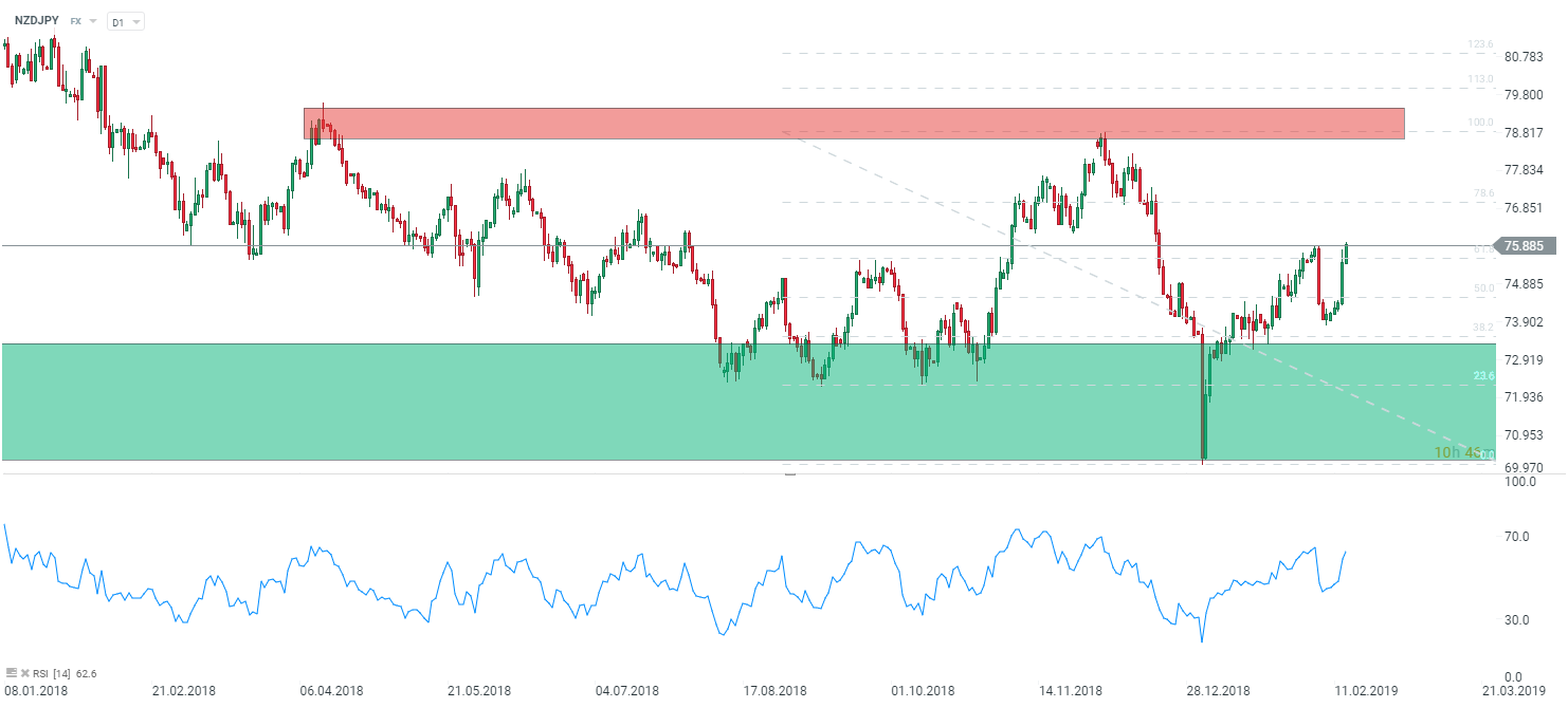 Para NZDJPY jest parą w której zmienność była raczej ograniczona w 2018 roku. Para ta głównie traciła. Zmienność wzrosła znacząco pod koniec roku wraz ze wzrostem słabych nastrojów. Obecnie biorąc pod uwagę dobre nastroje można oczekiwać dalszych wzrostów, choć powinny być one ograniczone do okolic strefy podażowej przy poziomie 79.00. Bardzo silna strefa popytowa znajduje się pomiędzy poziomem 73 a 71. Źródło: xStation5