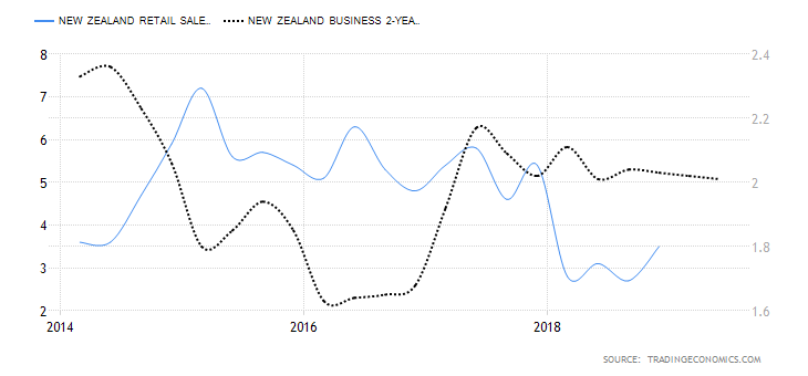 W przypadku sprzedaży detalicznej w Nowej Zelandii w minionych 4 kwartałach zeszłego roku obserwowaliśmy znaczne osłabienie się dynamiki. Jeszcze na koniec 2017 roku ta dynamika wynosiła 5,4% r/r, natomiast w poprzednim roku uśredniła się w okolicy 3%. Niemniej ostatni kwartał przyniósł odbicie do 3,5% i obecnie prognozy ilościowe wskazują na odbicie w okolice 4,2% r/r. Jak prezentują się dane w ujęciu kwartalnym? Teoretycznie nie najlepiej. Dynamika sprzedaży ma się osłabić do 0,6% k/k z poziomu 1,7% k/k. Bazowa sprzedaż detaliczna ma osłabić się do 0,9% k/k z poziomu 2,0% k/k.