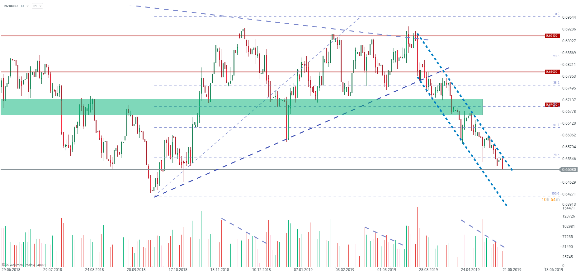 Dolar nowozelandzki jest obecnie bardzo silnie wyprzedany. Warto zwrócić uwagę na ekstremalnie niski wolumen, który może sugerować potencjalne kończenie się trendu spadkowego. Z drugiej strony para ma dosyć sporo miejsca do spadków, gdyż kolejnym mocnym wsparciem jest dopiero lokalny dołek z września zeszłego roku. Źródło: xStation5