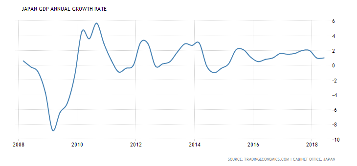 W Japonii nie obserwowaliśmy spadku PKB od 2014 roku. Niemniej widać, że wzrost tak czy inaczej w tym roku jest relatywnie słaby. Rynkowe oczekiwania wskazują na powrót do wzrostu w IV kwartale oraz umiarkowany wzrost w całym przyszłym roku. Niemniej warto przypomnieć, że premier Japonii, Shinzo Abe zapowiedział podwyżkę podatku od sprzedaży w przyszłym roku bazując na zdrowym zachowaniu się gospodarki. Źródło: Trading Economics