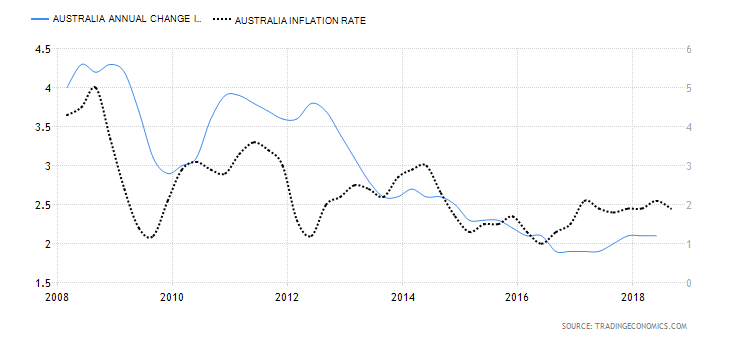 Zmiana stóp procentowych w Australii jest na razie jeszcze wykluczona, ale zwiększenie się presji na ceny ze strony płac mogłyby przynajmniej zmienić nieco komunikację banku centralnego. Źródło: Trading Economics