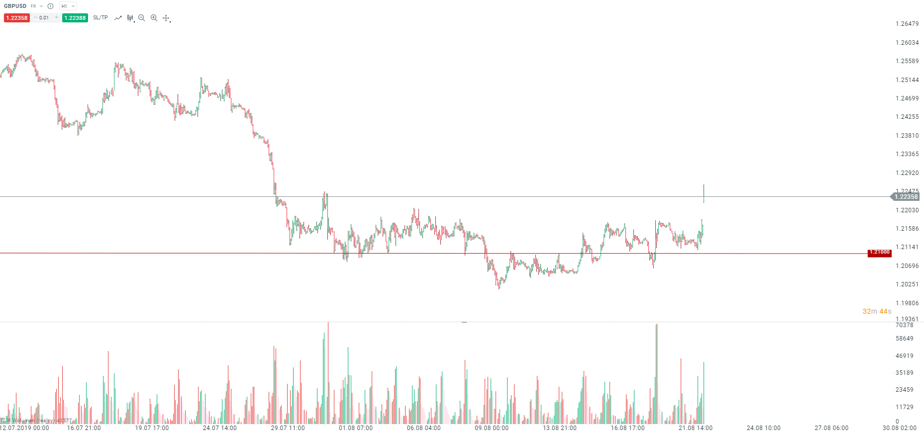 Silne wybicie na funcie po komentarzach Merkel. Wybicie górrnej granicy konsolidacji znajdującej się w okolicach poziomu 1,2200. Kolejne silne opory to dopiero okolice poziomu 1,2400. Źródło: xStation5