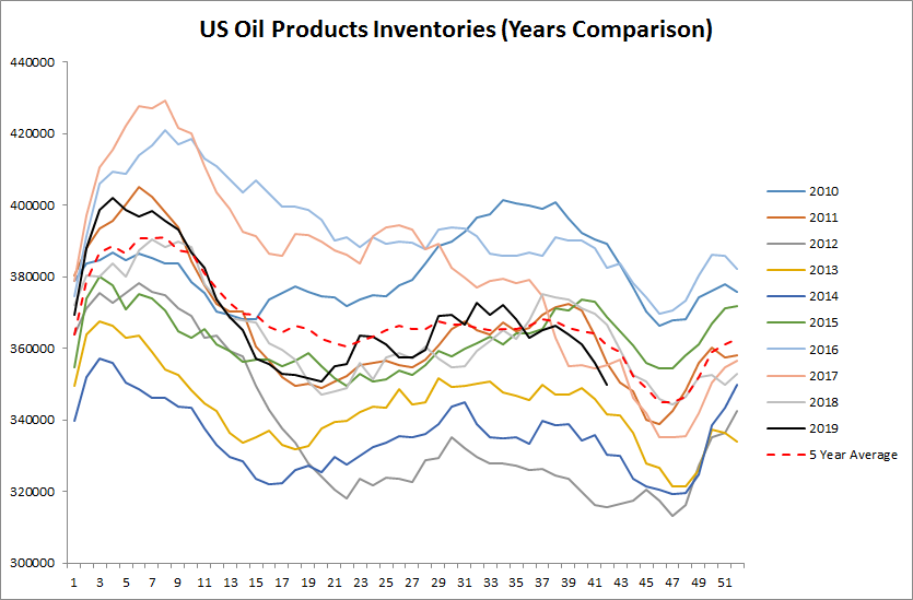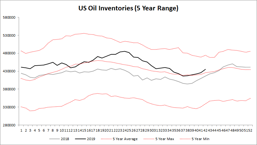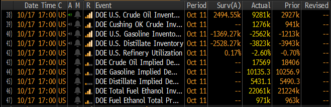 Zapasy ropy rosną zdecydowanie więcej, ale jest to zgodne z sezonowością. Tempo wzrostu zapasów jest identyczne jak w zeszłym roku w analogicznym okresie. Źródło: Bloomberg