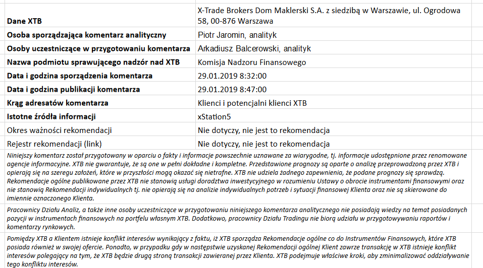 Ta publikacja handlowa jest informacyjna i edukacyjna. Nie jest rekomendacją inwestycyjną ani informacją rekomendującą lub sugerującą strategię inwestycyjną. W materiale nie sugerujemy żadnej strategii inwestycyjnej ani nie świadczymy usługi doradztwa inwestycyjnego. Materiał nie uwzględnia indywidualnej sytuacji finansowej, potrzeb i celów inwestycyjnych klienta. Nie jest też ofertą sprzedaży ani subskrypcji. Nie jest zaproszeniem do nabycia, reklamą ani promocją jakichkolwiek instrumentów finansowych. Publikację handlową przygotowaliśmy starannie i obiektywnie. Przedstawiamy stan faktyczny znany autorom w chwili tworzenia dokumentu. Nie umieszczamy w nim żadnych elementów oceniających. Informacje i badania oparte na historycznych danych lub wynikach oraz prognozy nie stanowią pewnego wskaźnika na przyszłość. Nie odpowiadamy za Twoje działania lub zaniechania, zwłaszcza za to, że zdecydujesz się nabyć lub zbyć instrumenty finansowe na podstawie informacji z tej publikacji handlowej. Nie odpowiadamy też za szkody, które mogą wynikać z bezpośredniego czy też pośredniego wykorzystania tych informacji. Inwestowanie jest ryzykowne. Inwestuj odpowiedzialnie.