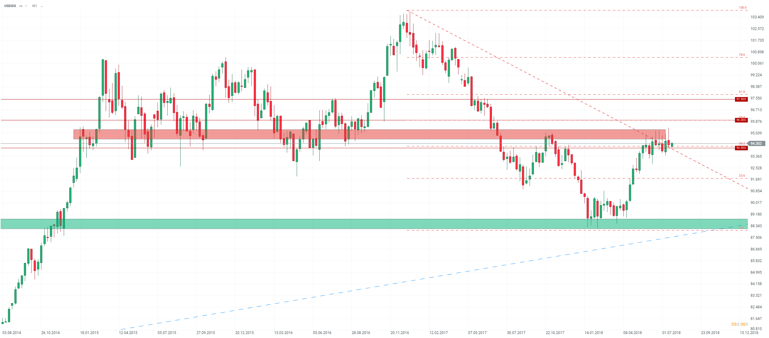 Tymczasem dane te nie specjalnie przeszkadzają amerykańskemu dolarowi. W zeszłym tygodniu indeks dolara stracił i zaknął się poniżej otwarcia. Niemniej utrzymane zostały poziomy powyżej zniesienia 38.2 i dzisiaj pomimo negatywnego otwarcia, cena wraca powyżej tego poziomu. Niemniej do okolic poziomu 95 punktów obserwujemy bardzo wyraźną strefą podażową.