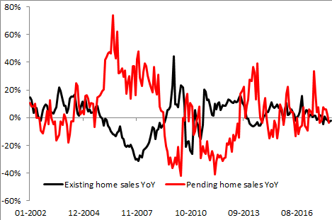 W ujęciu rocznym sprzedaż nieruchomości mieszkalnych spada, co powinno być czynnikiem alarmującym. Problemem może być jednak podaż domu. Niemniej warto śledzić te dane pod względem potencjalnego spowolnienia w USA. Źródło: Macrobond, XTB